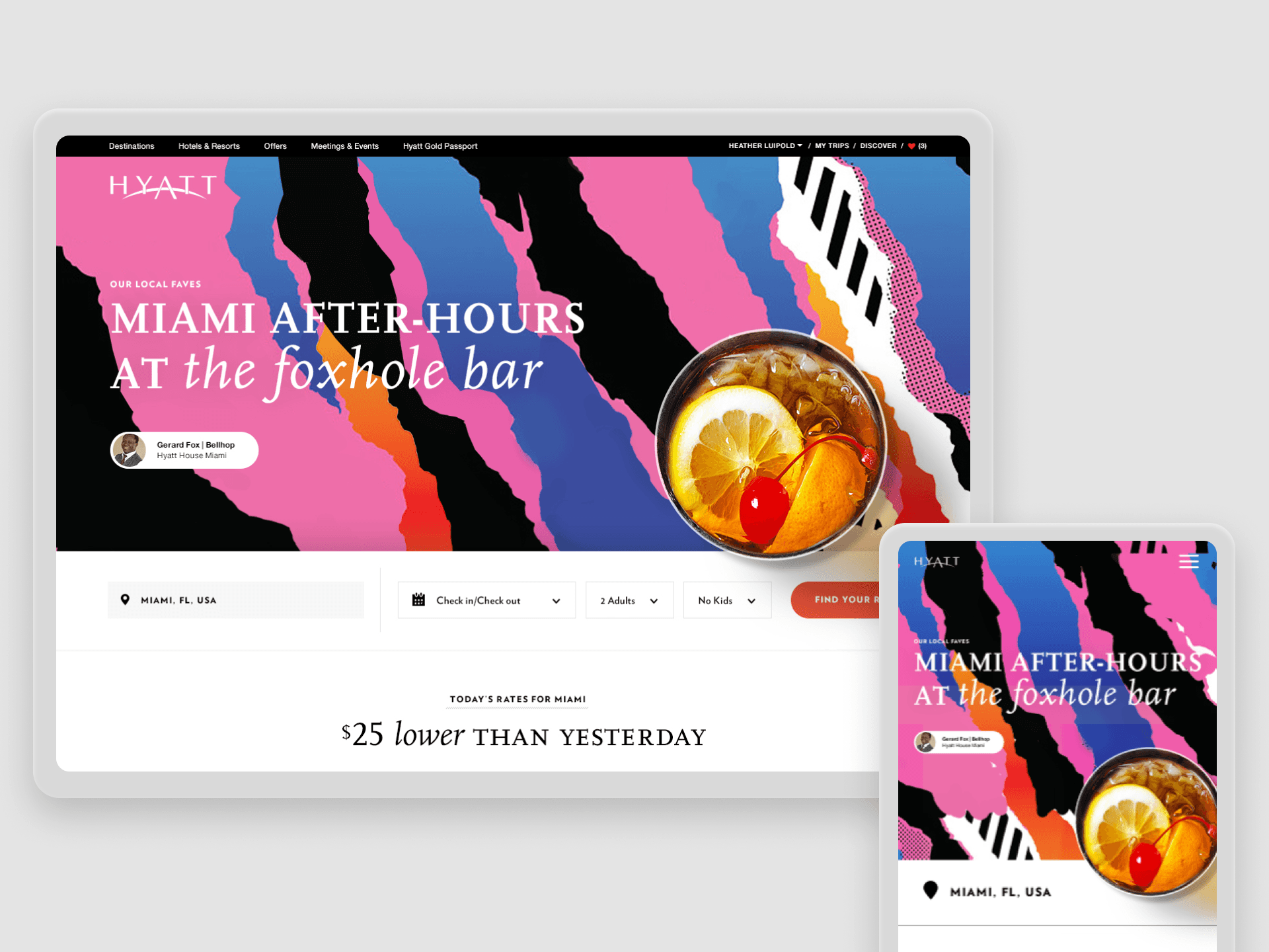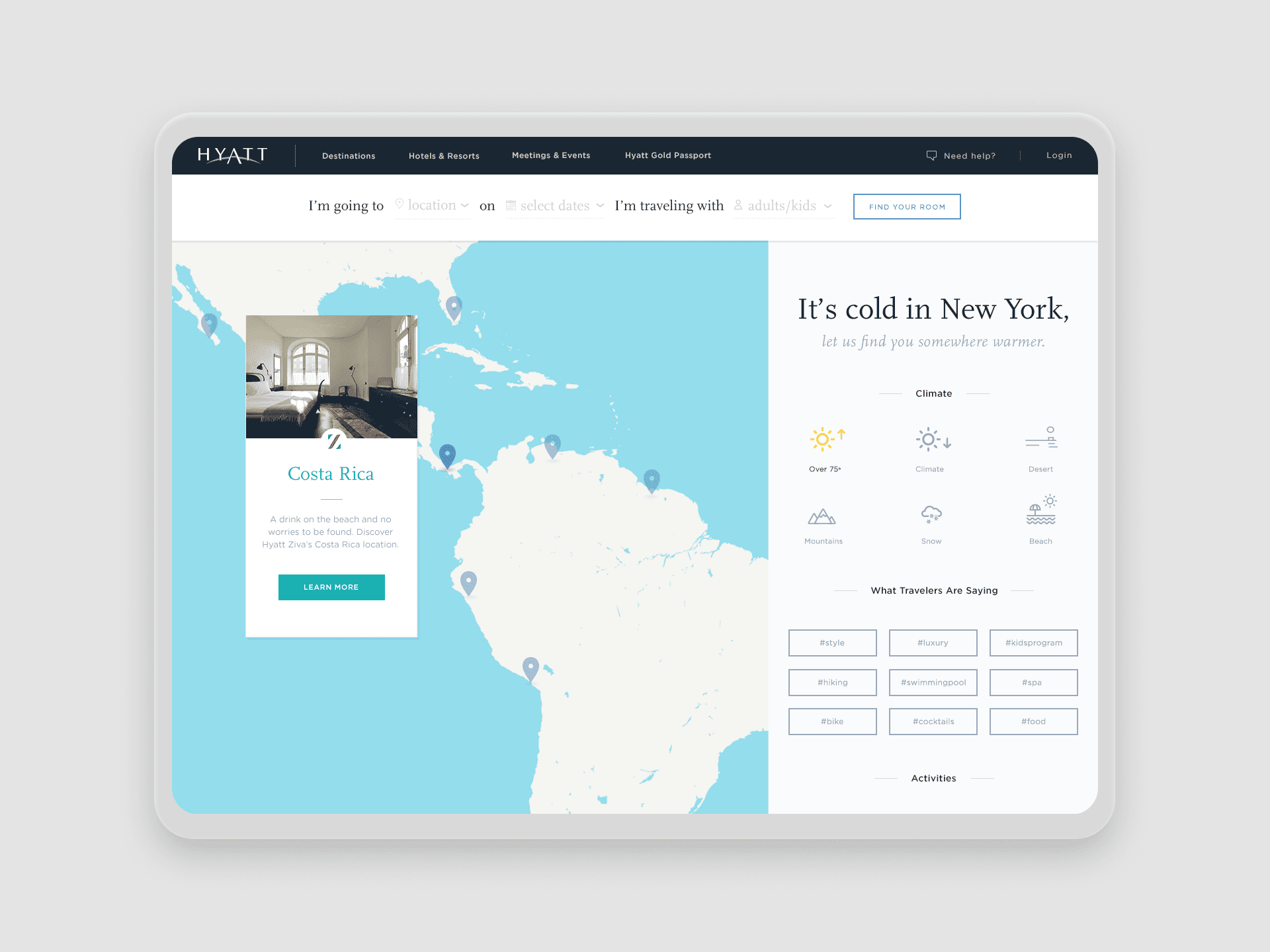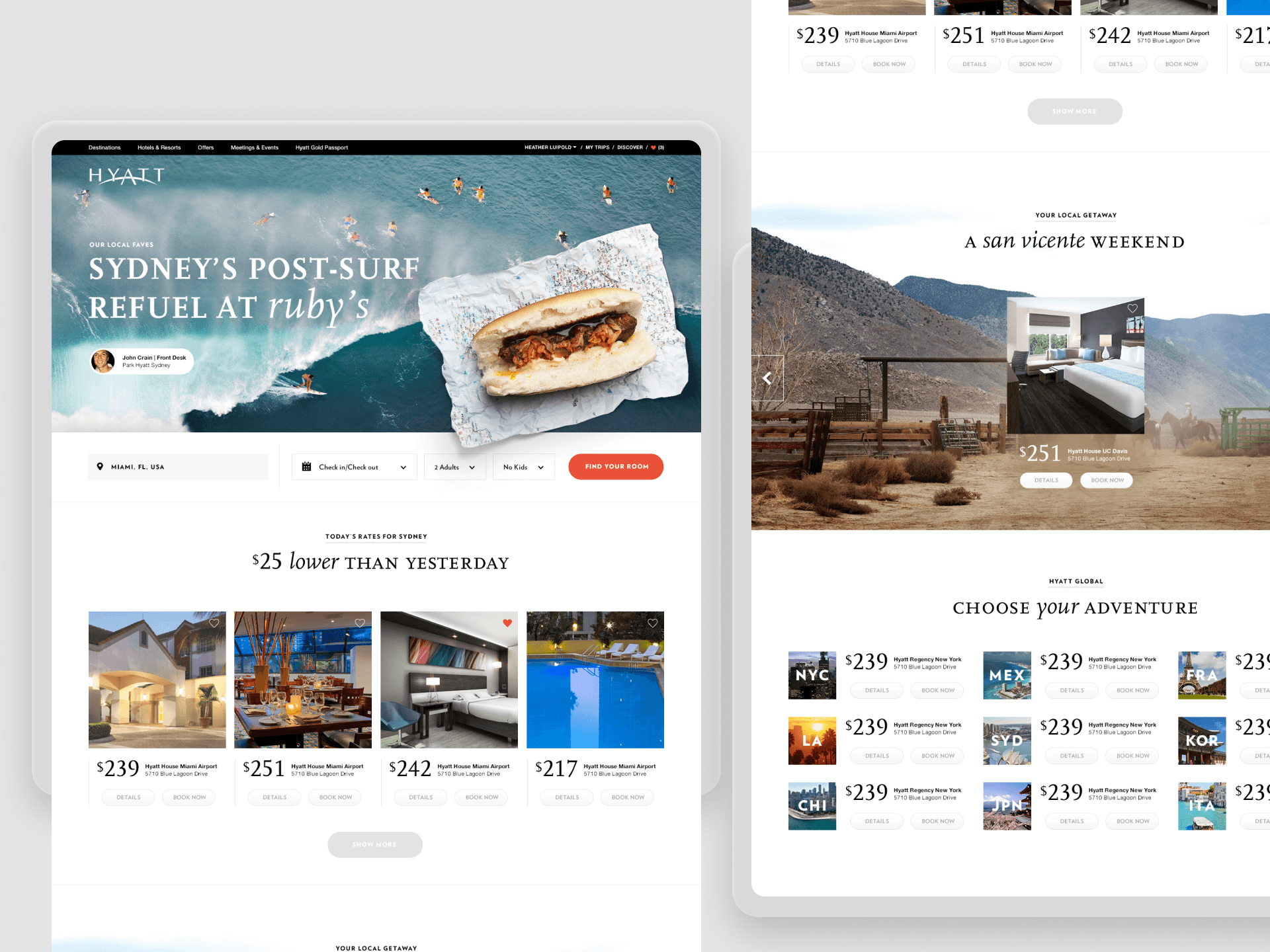 Another project that my wife and I designed while working together. Hyatt was looking to update their online booking process and in simply improve conversion on their own prooperties. It's another case of an internal team tossing over a big digital product over the fence. This time we were hired by an Rokkan (now defunct) to be hired guns essentially. Little oversight, just design "dope screens" for a pitch.